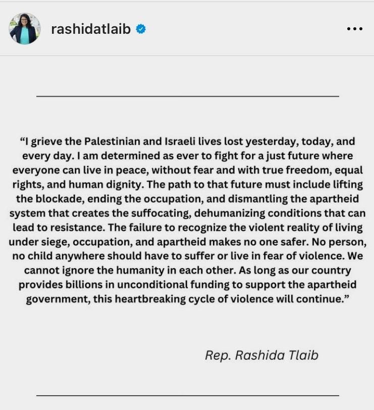 In the very first sentence—“yesterday, today, and every day”—Tlaib minimizes the extraordinary horror of the attack. She fails to identify victims or aggressors. She blames a “system,” “conditions,” and a “violent reality” that “lead to resistance.” Without context, it’s impossible to tell from Tlaib’s words that Hamas terrorists slaughtered and kidnapped civilians en masse.