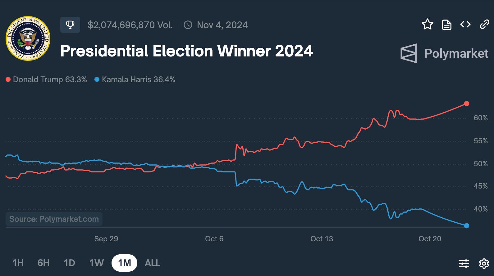 Right-wing personalities have also latched on to the Polymarket odds. Shock jock Steven Crowder posted on X that “No one has seen a lead like this in recent history.” Crowder is correct in one important way: Hubert Humphrey and Dick Nixon never led one another in online cryptocurrency betting markets. The internet was still 15 years away in 1968, and cryptocurrency was still more than four decades out.