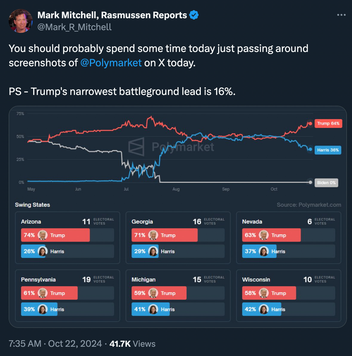 Mark Mitchell, the head pollster at Rasmussen Reports, a flimsy polling operation whose staffers regularly deny the results of the 2020 election, posted that Trump has significant leads in battleground states on Polymarket.