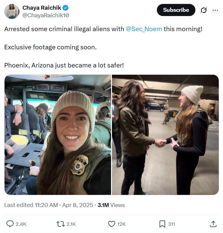 I find the cosplay pretty funny; Alina Habba in Newark, Noem with her push-up bra and tight white T-shirt at the prison in El Salvador. I'm sure the MAGA base gets excited seeing these women in flak jackets, but most of us know that competent administrators don't need to play dress up.