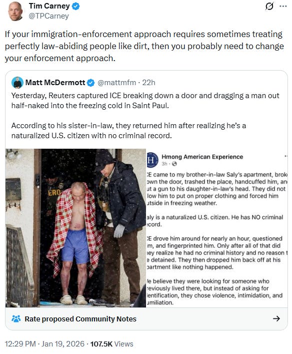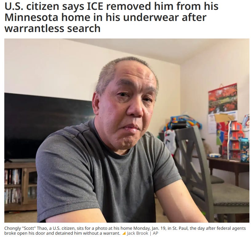 PAY NO ATTENTION TO THE CITIZENS DRAGGED FROM THEIR HOMES: As ICE’s jaw-dropping rampage through Minneapolis continues, more and more horror stories are emerging every day—and the administration’s apparent lies about them keep piling up, too. Yesterday, photos and video went viral of ICE agents escorting an old man out of his house; he was pictured wearing only shorts, sandals, and a blanket draped across his shoulders as they guided him into the sub-zero Minnesota weather.