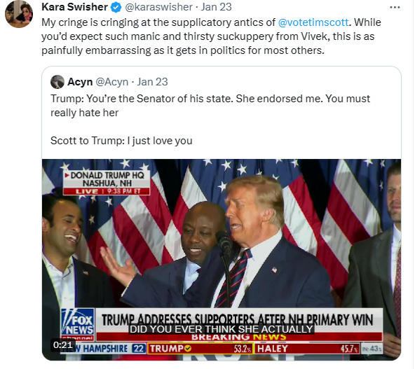 Scott’s willingness to endure Trump’s ritual humiliation of him raises a number of important questions. How many Republicans left in the party are willing to tell the truth about Trump? How much further will Scott and his competition go in pursuit of the vice presidency? How much can abasement can any one person take before collapsing in on themselves like a dying star? And, of course, how funny will it be if this ends with Scott earning the same reward Chris Christie did back in 2016? Or, crueler still, a stint as Commerce Secretary?