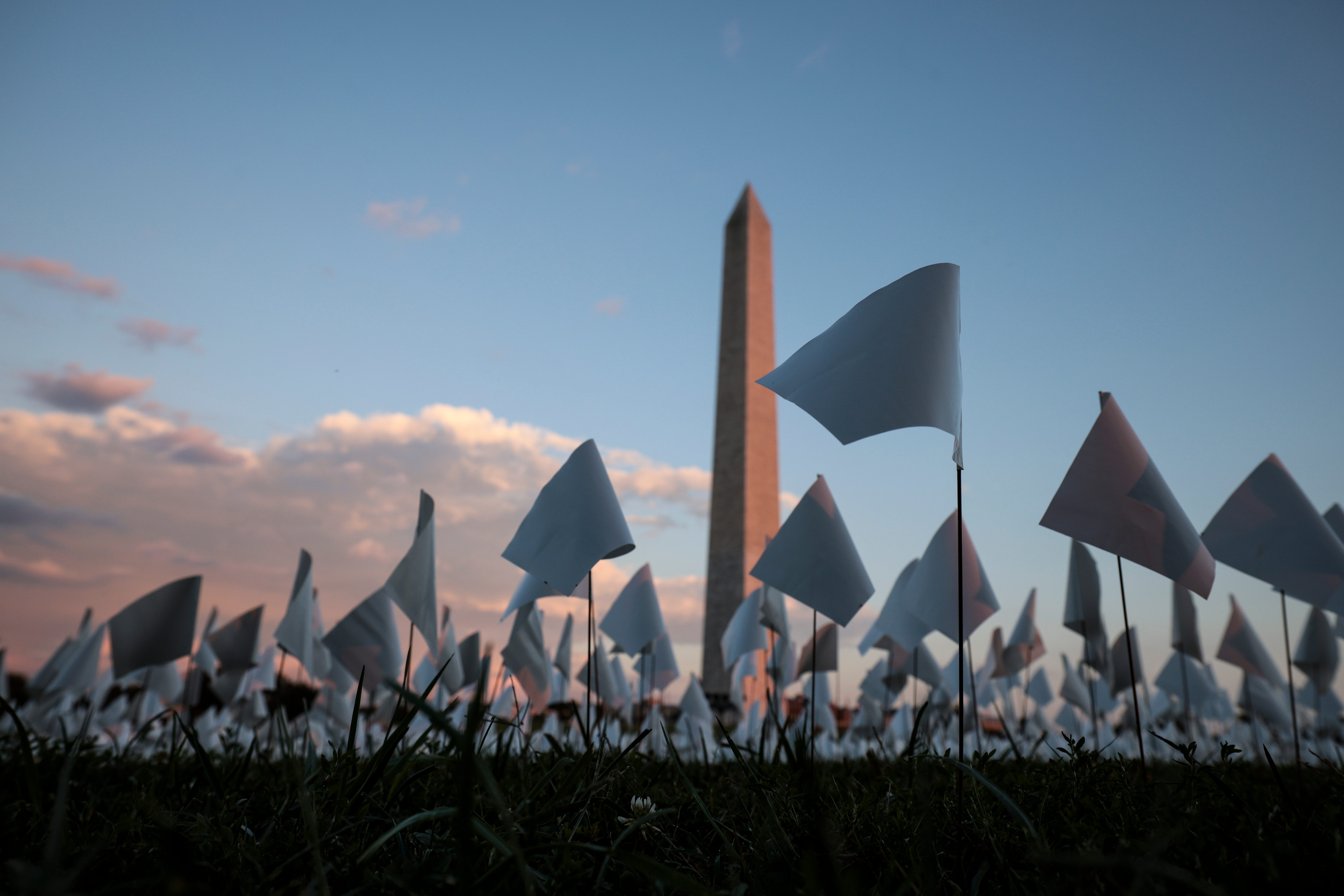People visit the 'In America: Remember' public art installation near the Washington Monument on September 18, 2021 in Washington, DC. The installation commemorates all the Americans who have died due to COVID-19, a concept by artist Suzanne Brennan Firstenberg, includes more than 650,000 small plastic flags, some with personal messages to those who have…