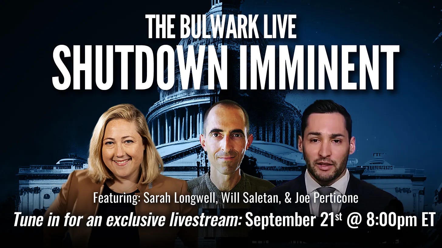 Sarah, Will and Joe will gather for Thursday Night Bulwark tonight to discuss the mayhem on the Hill as the clock ticks down to a possible government shutdown. Plus, Sarah will preview the return of The Focus Group podcast—new weekly episodes start this Saturday. The livestream starts at 8pm in East.