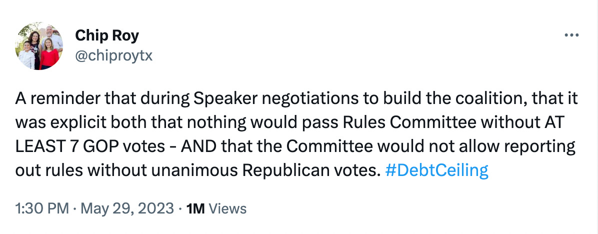 Now these far-right Republicans are doing everything they can to derail the deal. Rep. Chip Roy (R-Texas) is claiming he made a secret deal with McCarthy that nothing would leave the Rules Committee—to which McCarthy begrudgingly appointed Roy and several other ultraconservatives—without unanimous consent from the panel’s Republicans.