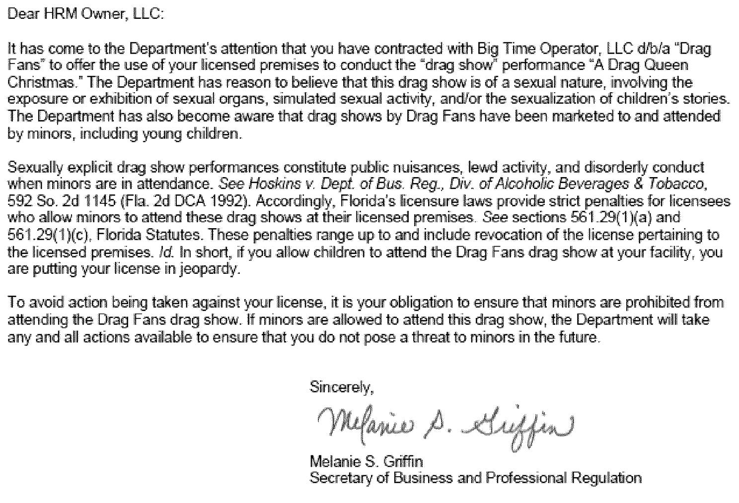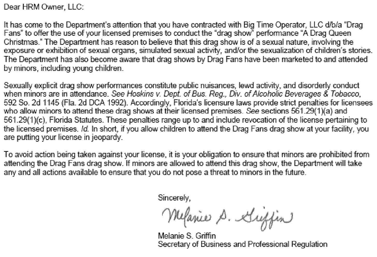 Someone was keeping tabs on this event and submitted a complaint to the Florida Department of Business and Professional Regulation, which in turn sent the Hyatt a letter warning them that the event they had contracted to host could result in them being pursued by the state government.1 Here’s the letter: