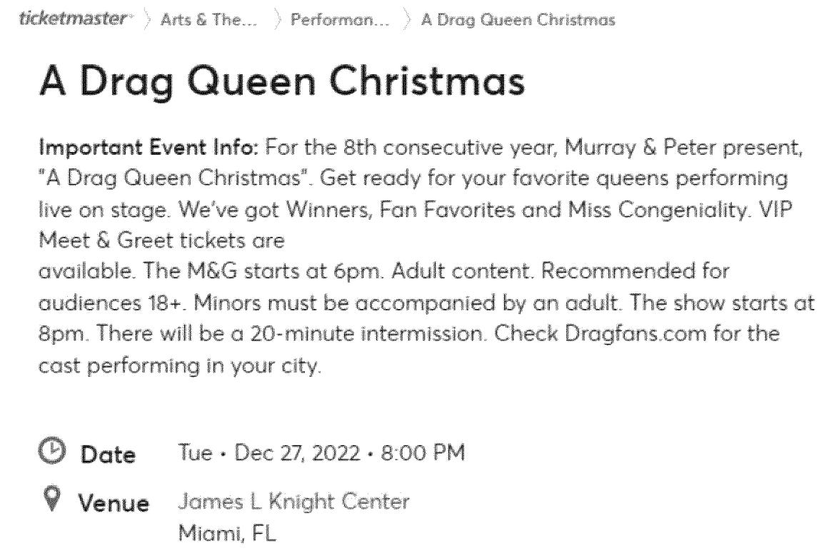 The production company which runs “A Drag Queen Christas” originally used the phrase “All Ages Welcome” on its ticketing website. (As the venue, the Hyatt did not handle ticketing.)
