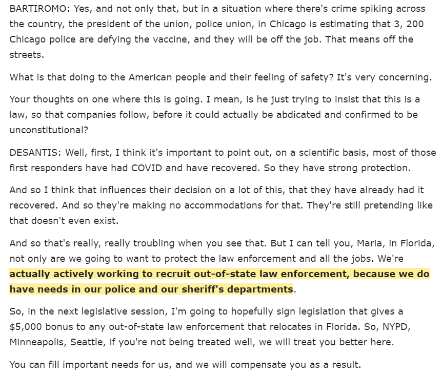 Over the weekend, Florida’s Ron DeSantis suggested that his state would offer $5,000 signing bonuses to out-of-state cops who left their jobs because they had defied vaccine mandates.