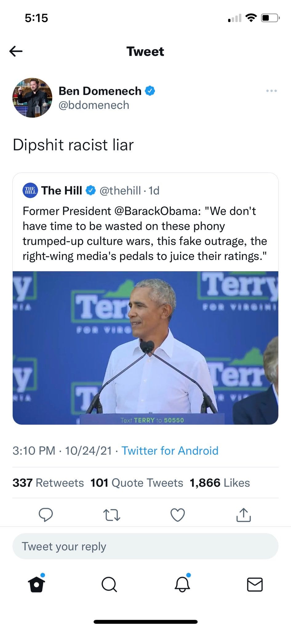 Wow, if Ben Domenech called Obama a dipshit racist liar for basically saying culture wars are exasperating and distracting, I wonder what he would call someone who said this about his wife and late father-in-law: