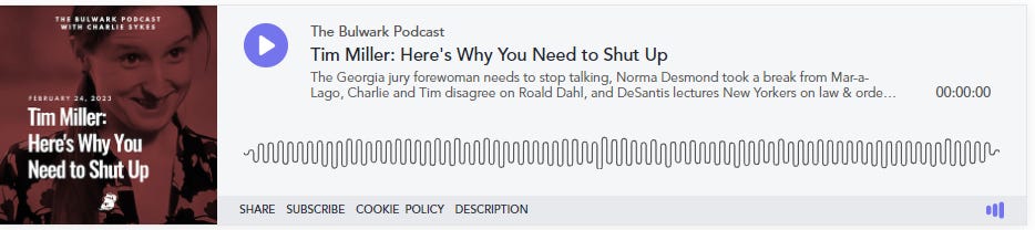 On Friday’s podcast: Tim Miller and I talk about the Georgia jury forewoman, disagree on Roald Dahl, (and are joined by a special guest) and discuss the DeSantis lecture to New Yorkers on law & order.