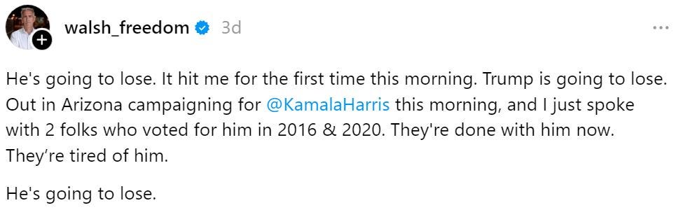 Some Never Trump Republican and former Republican allies are trying to mainline confidence into Democratic veins. Here’s former Illinois Rep. Joe Walsh this week: