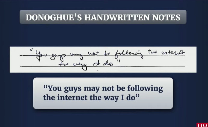 On a screen, the committee showed Donoghue’s handwritten notes from the phone call: “just say that the election was corrupt + leave the rest to me and the R. Congressmen.” Donoghue told the committee, “That’s an exact quote from the president.”
