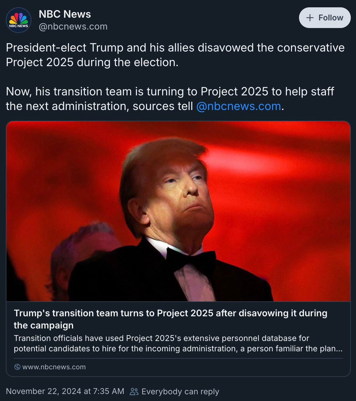 Morning shots quote: "Now wait just a minute. Are you telling us that Donald Trump’s constant outbursts denying he’d ever heard of any such thing as a Project 2025 in his life were just election-season lies??"