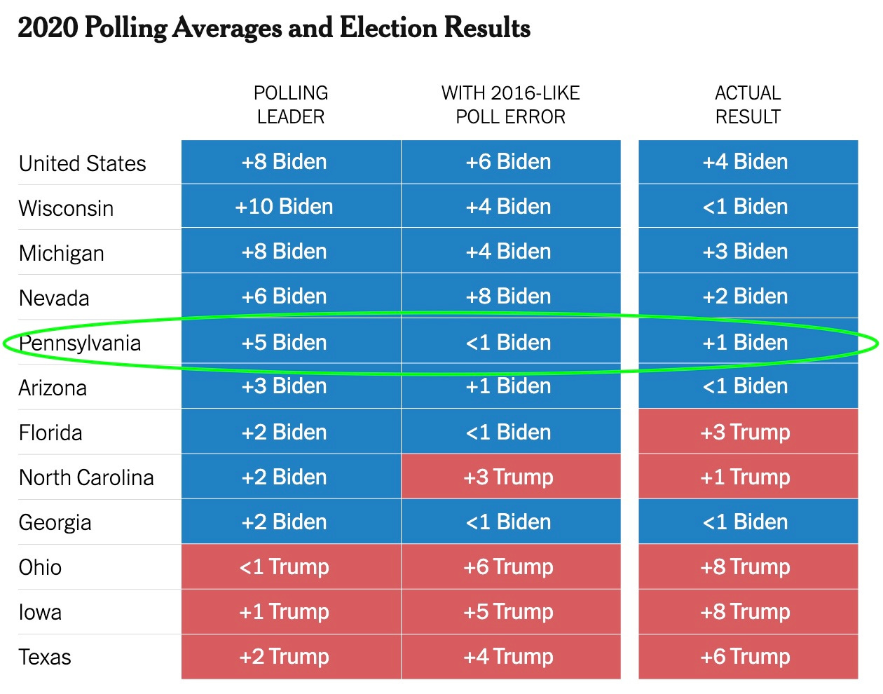 I’m not the only one. Over at the NYT, Nate Cohn sounded the alarm by putting together a little table. On the left was the 2020 polling leader. Then Cohn applied the 2016 polling error to the 2020 polling numbers. And then he gives you the actual 2020 result. Have a look at what that gives you in Pennsylvania.