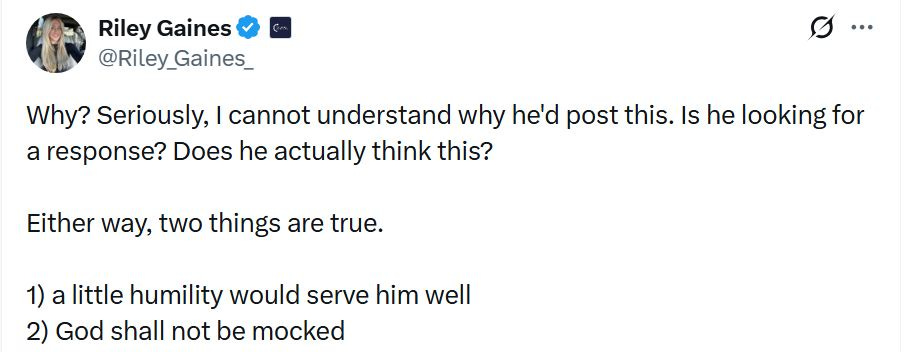 It’s the subplot involving Riley Gaines. Fox News contributor. Prolific social media troll. Famous NCAA freestyle fifth-place finisher. Noted cisgender woman whom Trump last year personally praised as “a tremendous athlete” while signing an executive order with her standing nearby. Gaines was clearly in Trump’s good books—but she’s also a student of the Good Book, and she took to X to express her dismay at the president’s God-displacing post: