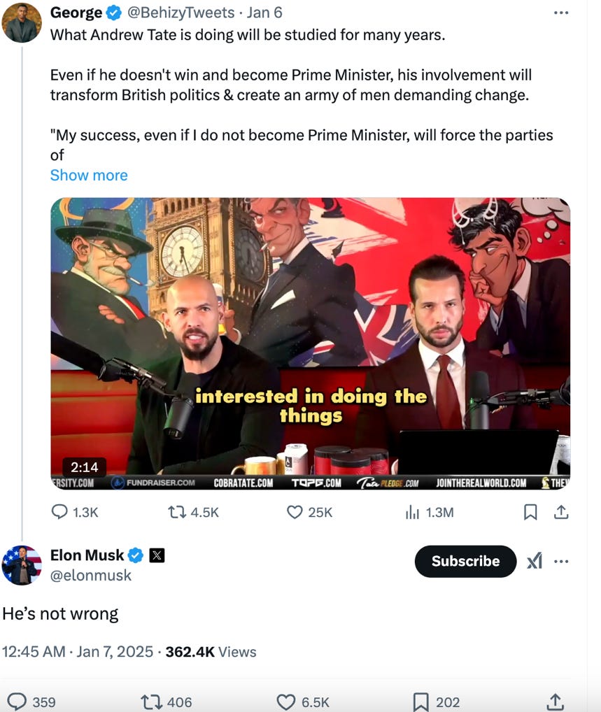 As for the sincerity of Musk’s crusade against sexual violence, it can be gauged by the fact that, right on the heels of his tweets castigating British pols for supposedly being soft on child rape, he seemed to endorse the entry into British politics of Andrew Tate, the self-styled misogynist influencer whose advice to men includes “slap, slap, grab, choke, shut up, sex” as a response to a woman’s accusation of cheating.