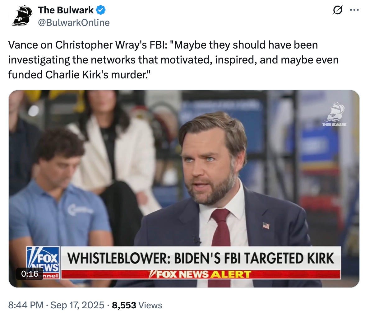 In the same afternoon that ABC was given the choice of canning Kimmel in either “the easy way” or “the hard way,” Vice President Vance created another story. He said that under Christopher Wray, its former director, the FBI, “should have been investigating the networks that motivated, inspired, and maybe even funded Charlie Kirk’s murder.”