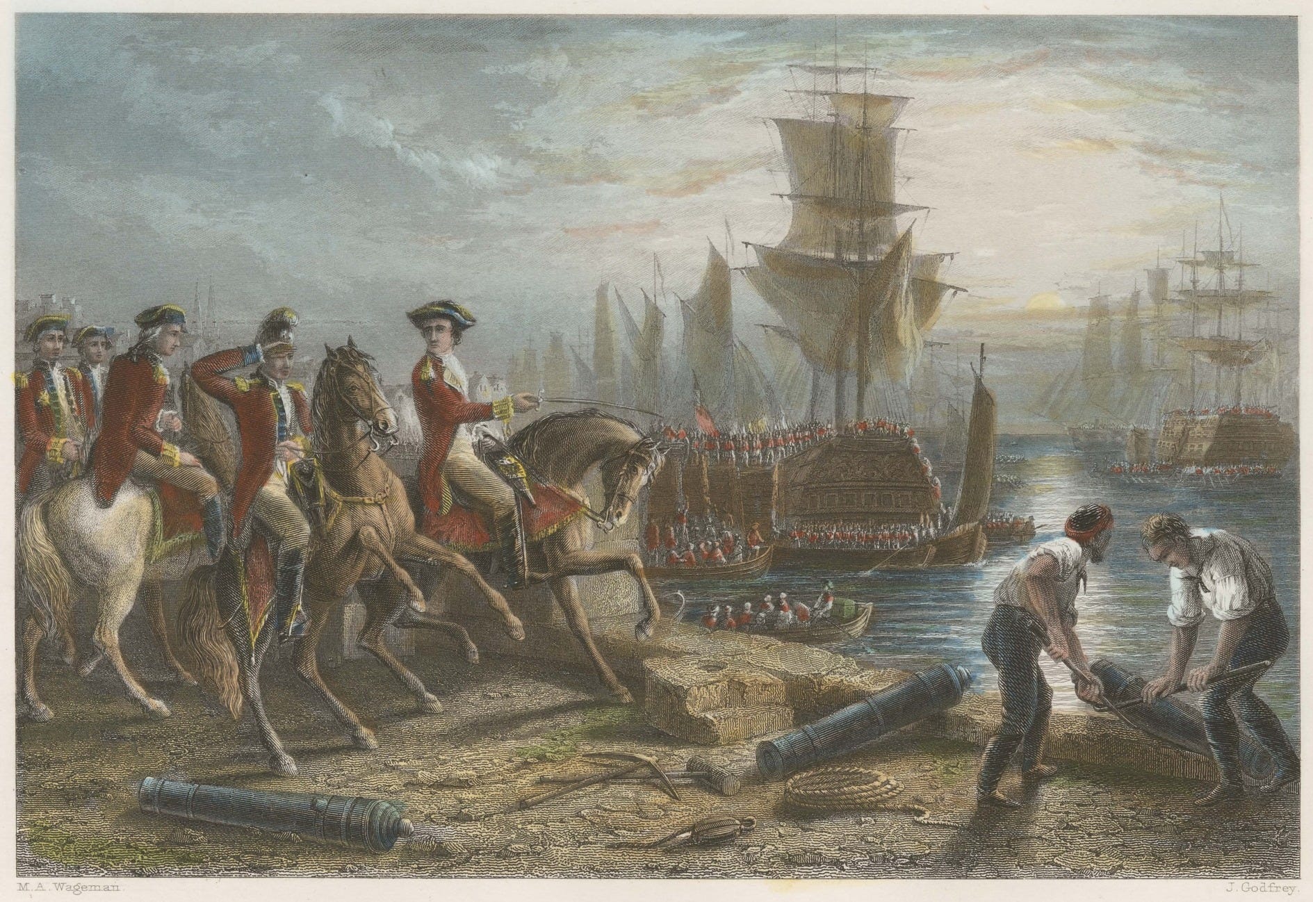 By the mid-morning of March 17, the British evacuated a total of “11,000 people including 8,906 troops, 1,100 loyalists and 553 children.” Washington described the “hurry in which they have Imbark’d.” The British left more than “30,000£s worth of his Majestys Property behind them, in Provision’s and Stores, Vessels, Rugs Blankets &ca.” They had also abandoned “near 30 pieces of fine heavy Cannon” as well as “all their Artillery Carts, Powder Waggens,” and ammunition “in abundance.”