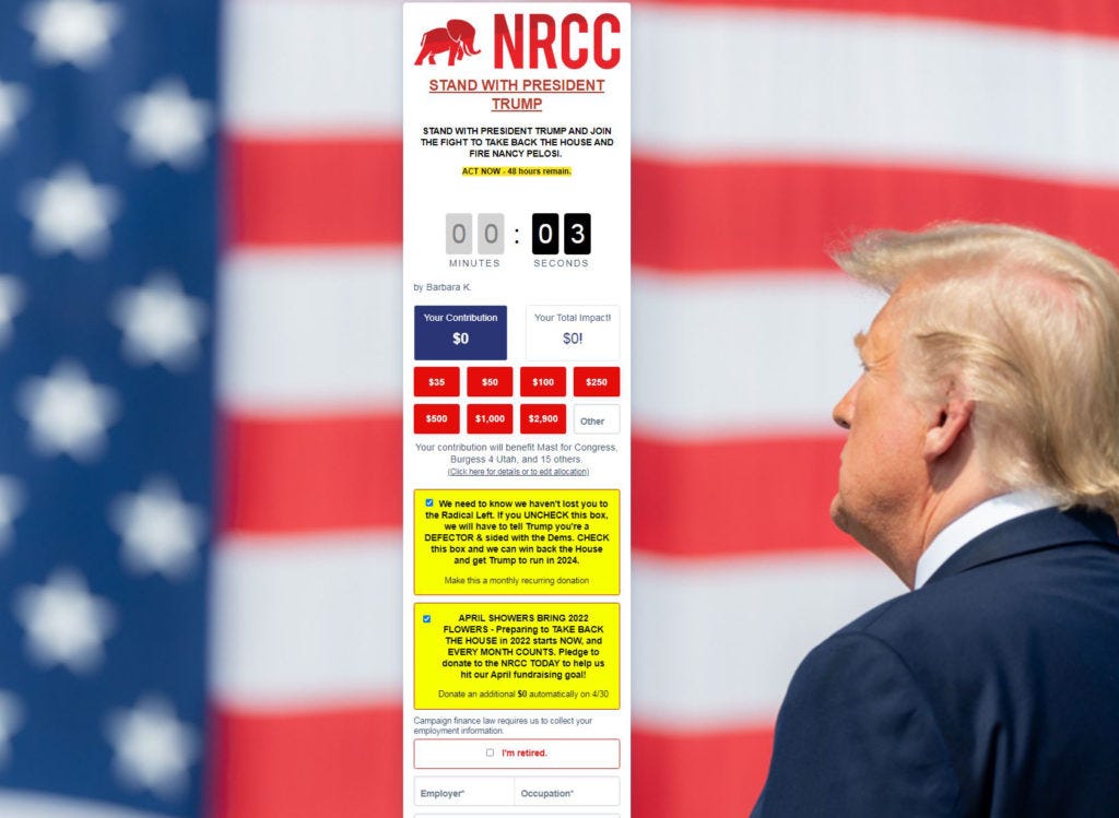 The New York Times reported last weekend that the Trump campaign had to return over $100 million in donations from supporters who were duped by bunco fundraising language that, among other things, made recurring donations the default setting for supporters lured by the campaign’s conspiracy-laden pitches. And, as we outlined earlier this week, the NRCC continues to use similar practices—the most outlandish of which is the threat “to tell Trump” that anyone who unchecks a box committing to monthly donations in perpetuity is “a DEFECTOR & sided with the Dems.”