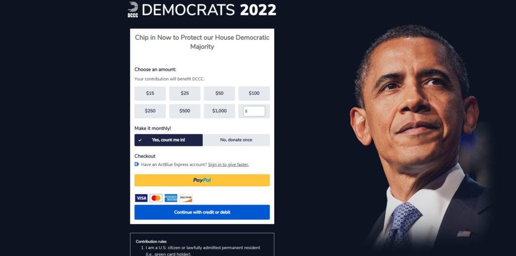 Let’s take a closer look at this comparison between NRCC’s tactics and those of the “Democrats and ActBlue.” In a superficial sense, yes, both send users to sites with pre-checked boxes for recurring donations. But any objective observer would come to the conclusion that the Trump campaign and the NRCC are pushing the tactic to a grifty extent that far exceeds their peers.