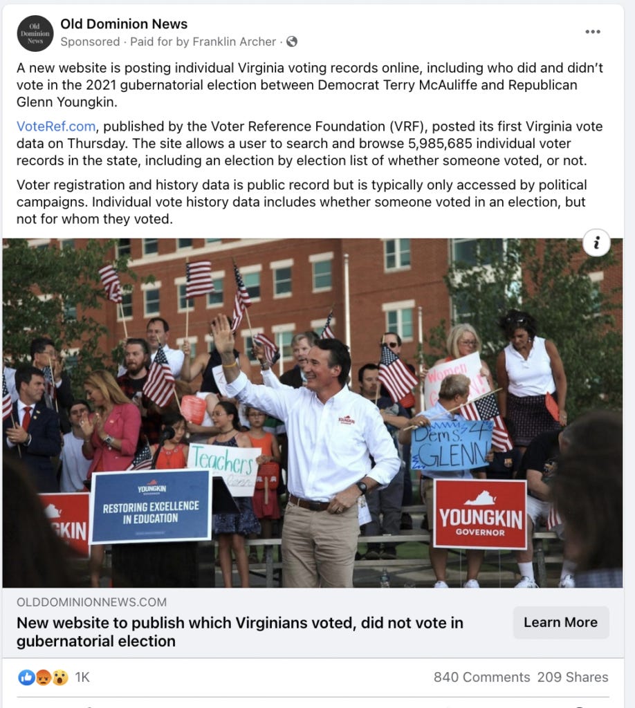 Finally, one can’t read too much into either the Youngkin or McAuliffe campaigns (or their allies) in Virginia based on the use of this sort of eleventh-hour Facebook advertising and astroturfed news outlet. This fake publication—and the hundreds of other such fakes out there, and the ads promoting them—are reminders of just how much money is mysteriously sloshing around on the hidden, fake-news, data-driven side of our politics.