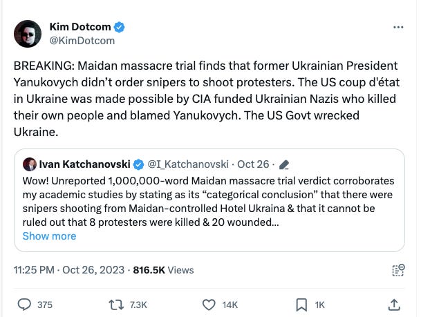 Claims that the killings were a false flag operation intended to topple Yanukovych and install a pro-Western government began to circulate almost immediately. No one has done more to give this conspiracy theory quasi-respectable cover than Ivan Katchanovski, a Ukrainian-born political scientist at the University of Ottawa. Katchanovski has authored several papers on the subject; as I noted in a Bulwark article last year, few other scholars take his work seriously, and it is generally viewed as politically motivated. He is, however, popular not only with the Russian propaganda machine but with Ukraine skeptics in the West, from right-wing British sociologist Noah Carl to American leftists Katie Halper and Aaron Maté.
