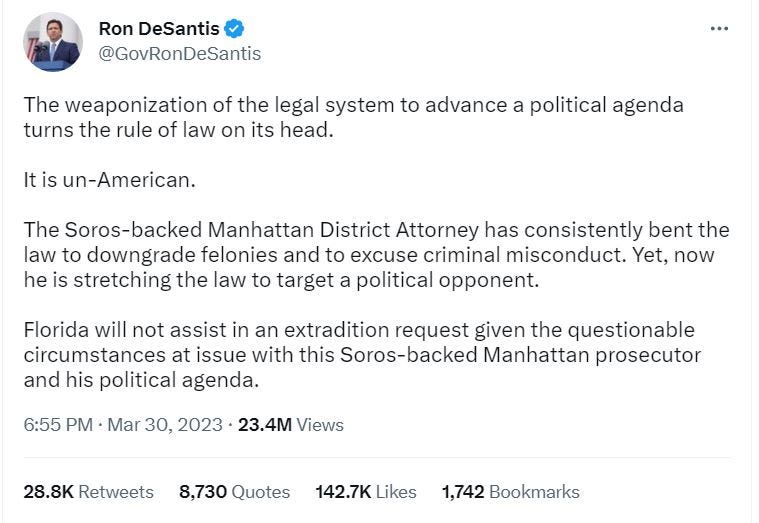 Here we have DeSantis posing like he has his chief political rival’s back. And on the same day a Manhattan grand jury delivered the news that a former president is not above the law, DeSantis, for his own partisan purposes, says that he is.