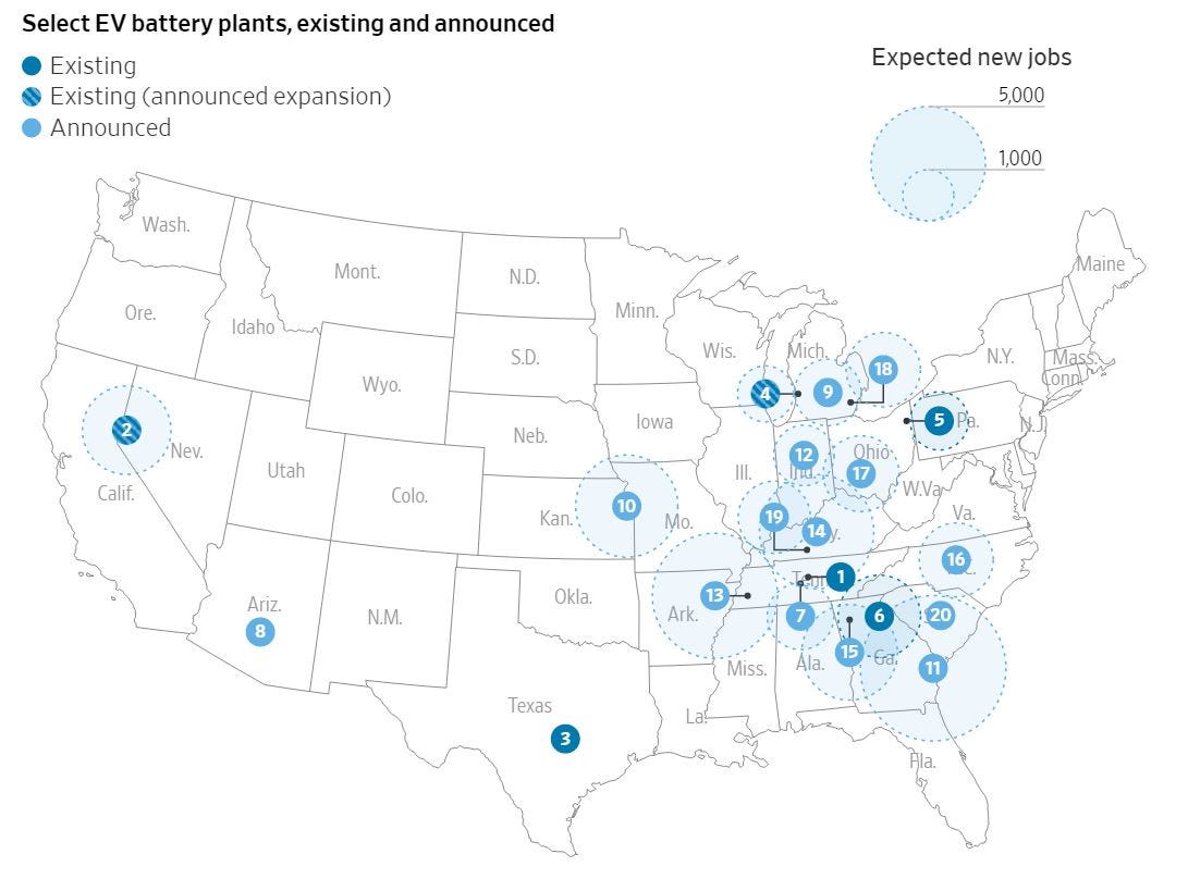 There has been some speculation that these new battery plants might be going all over the country, but as the reporters for the Wall Street Journal note in this excellent breakdown of the EV battery market, the big players want the new plants close to their existing plants. Michigan and Tennessee are big on existent vehicle-making, and the new jobs and investment will naturally be close by. According to one estimate, the forthcoming plants announced in 2022 could create some 150,000 jobs.