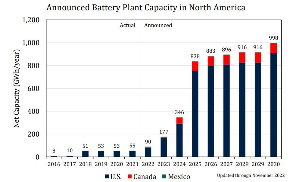 This graph, from Argonne National Laboratory, shows the plans for opening new battery plants in North America, measured in terms of the net capacity (in gigawatt-hours per year) of the plants’ output. Bigger is a reality:
