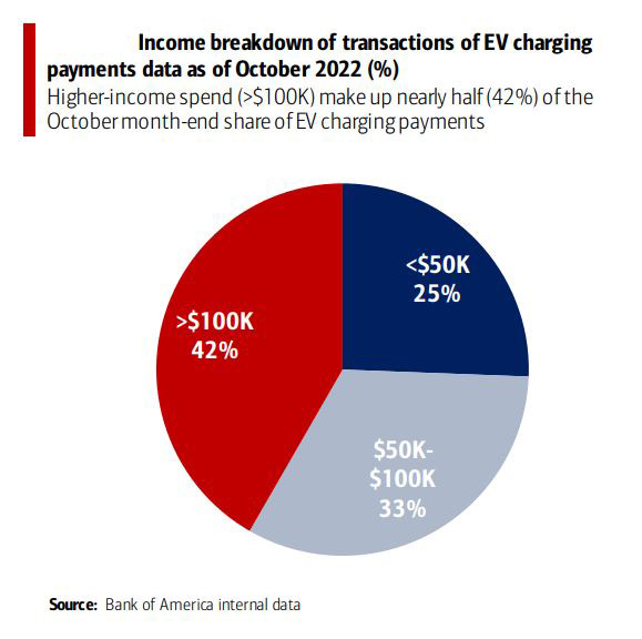 A Bank of America report finds that higher-income folks (with annual incomes greater than $100,000) made up 42 percent of the EV-charging payments last October. But transactions among middle-income Americans (with annual income between $50,000 and $100,000) made up another 33 percent of EV charges.