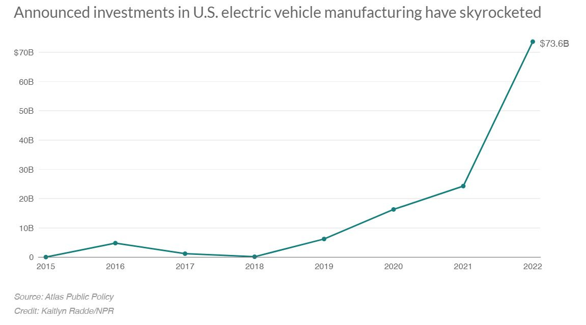 As NPR reports, last year the auto companies “announced more than $73 billion in planned projects, more than three times the previous record, set in 2021.” The increase since 2018 in investment related to battery productivity and vehicle assembly is astronomical. Check out this graph from NPR on overall EV investment—big companies don’t spend money like this unless they are fairly sure of the results: