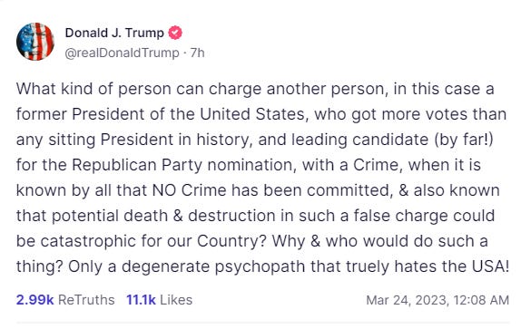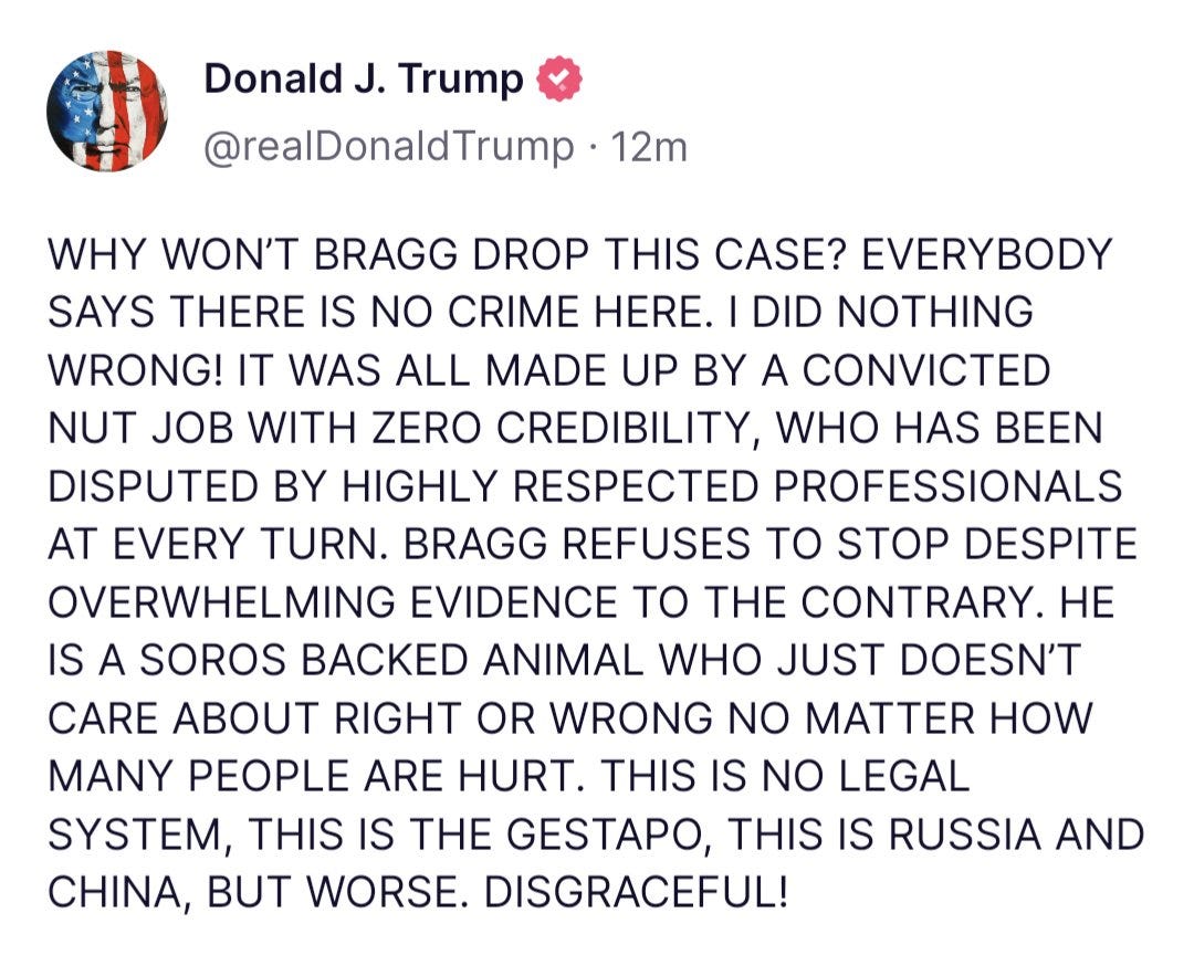 This came after Trump declared that “THIS IS NOT LEGAL SYSTEM, THIS IS THE GESTAPO, THIS IS RUSSIA, AND CHINA BUT WORSE” and called Manhattan DA Alvin Bragg a “SOROS BACKED ANIMAL,” which historian Kevin Kruse called a “nice racist two-fer.”