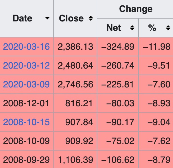 The two worst of these were in March 2020 as the markets began to grasp the full ramifications of COVID. The other drops all took place at the opening of the 2008 financial crisis.