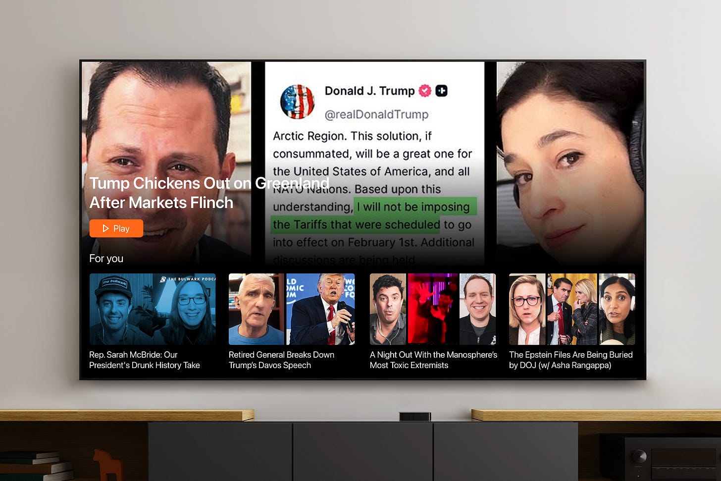 Substack TV… Last year when we started ramping up our video content, we heard from Bulwark+ members looking to get our shows on their TVs. We relayed this to our friends at Substack and at long last, Substack TV is here for smart TVs connected to Apple TV (set top box) and Google’s Play Store.1