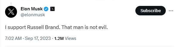 All the best people, Part Deux. “Elon Musk, Andrew Tate, Tucker Carlson defend Russell Brand.”