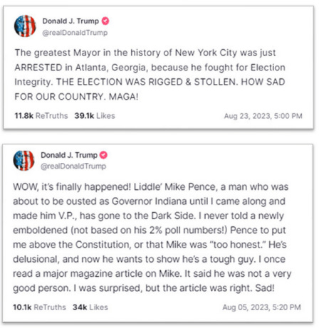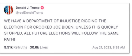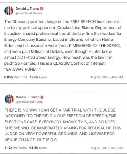 And on August 2, the defendant posted a quote alleging, without any basis, that the indictment that a federal grand jury in this case returned had been directed by the sitting president: “Joe Biden directed his Attorney General to prosecute his rival. This is not an independent Justice Department; this is not an independent special counsel. This is being directed by the Commander-in-Chief.”