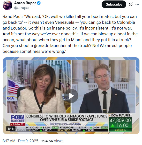 ANYTHING BUT THE U.S. COURTS: Last week, Sen. Tom Cotton pointed to two survivors of a U.S. military boat strike that the United States ended up repatriating to Colombia and Ecuador as evidence that the Pentagon wasn’t behaving indiscriminately toward people on the Caribbean boats it was destroying. But the New York Times reports that Pentagon lawyers originally had another idea for those survivors: What if they just sent them to CECOT?