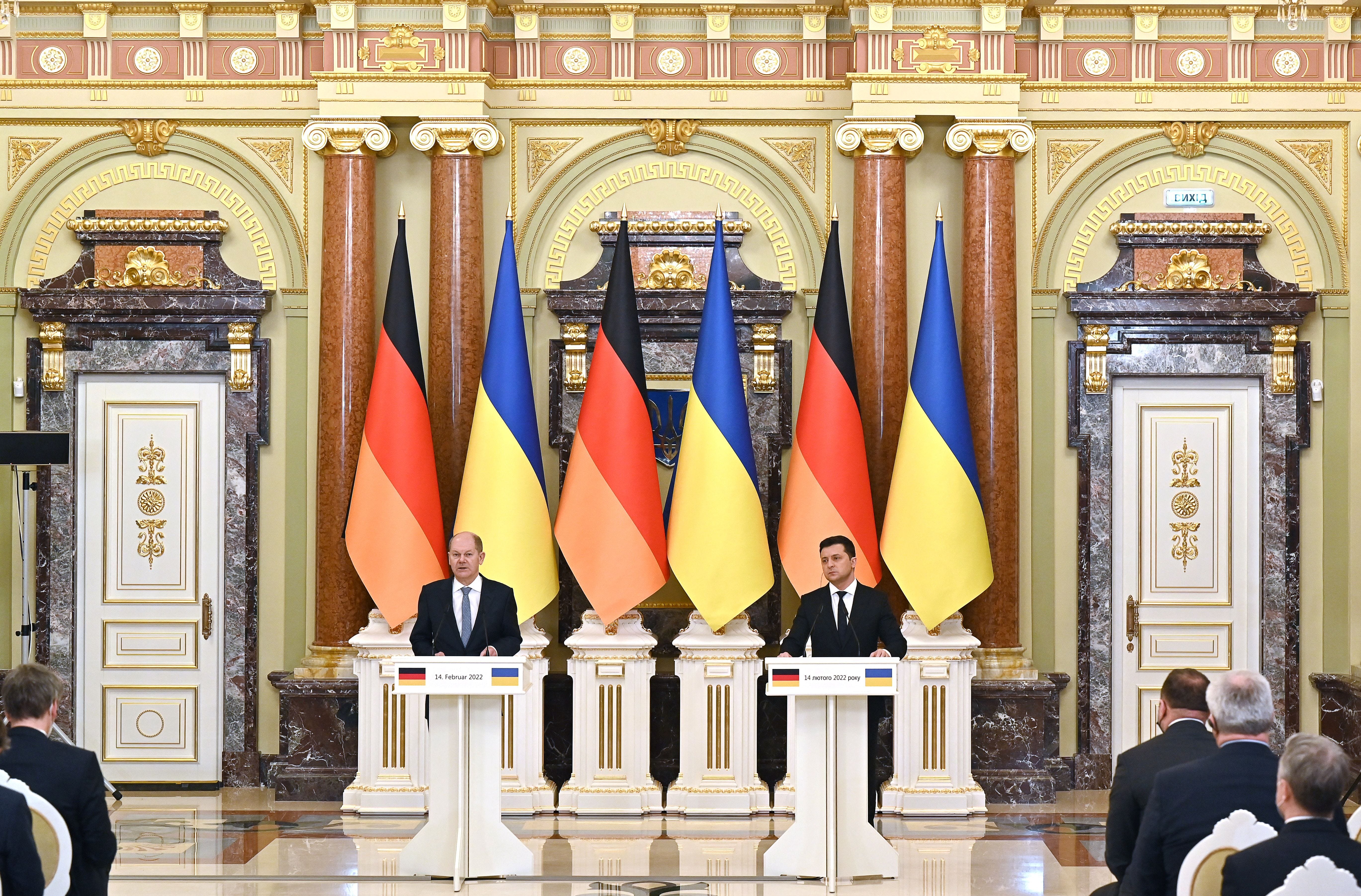 Ukrainian President Volodymyr Zelensky (R) and German Chancellor Olaf Scholz hold a joint press conference in Kyiv on February 14, 2022. - Scholz landed in Kyiv for crisis talks with Zelensky, ahead of a visit to Moscow to head off what Berlin said was the "very critical" threat of a Russian invasion of Ukraine. (Photo by SERGEI SUPINSKY/AFP via Getty I…