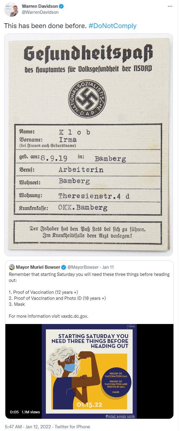Davidson apologized for but did not delete his Nazi-COVID tweet, which really is something to behold: