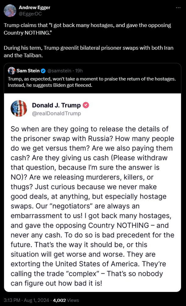 Trump likely assumed he was going to tail out of July with a big fundraising advantage over Joe Biden. But Biden’s candidacy is no more and that fundraising advantage is now a severe deficit. The former president announced his campaign and authorized committees raised $138.7 million in the month of July. By contrast, Kamala Harris announced this morning that her campaign had raised an eye-popping $310 million. Maybe the crazier stat: more than two million Harris donors were making their first donation of the cycle this month.