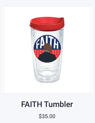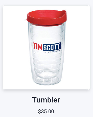 The black U.S. senator from South Carolina offers merchandise from shirts to socks to caps to a “Tim Scott Logo Sunglasses Strap.” He also sells something called a “FAITH Tumbler,” which, apart from the FAITH design, is otherwise identical to the item sold as “Tumbler.” (Kudos to Scott for providing a secular alternative.) The campaign’s main message, “Tim Scott / Faith In America,” appears on most items. The 18-product array includes “GREAT SCOTT!” T-shirts, sweatshirts, and stickers. Prices range from $7 (the stickers) to $65 (sweatshirts).