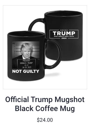 Mike Pence was arguably a bit late in finding fault with Donald Trump for getting his supporters to storm the Capitol seeking to hang him; the former vice president had to mull it over for a couple of years before disclosing how diddly-dang angry it made him. He may also have been a tad tardy in entering the 2024 race, which everyone knew he was going to do. Turns out Pence is also a bit behind in getting his merch out. There appears to be no portal on his campaign website to any sort of store. You can’t buy a thing except his love, at suggested amounts ranging from $15 to $1,500.