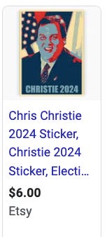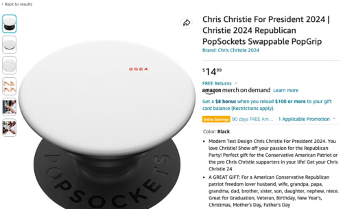 Here’s another guy who has somehow managed to launch a campaign with a website devoid of official merch. In fact, the former New Jersey governor’s site appears to contain nothing at all beyond a donation page and a YouTube clip. As with Pence, it is easy to find Chris Christie merch through private vendors. Among the scores of items available on the free market: “Christie 2024” socks, an Obamaesque campaign poster, and a “Christie 2024 Republican PopSockets Swappable PopGrip,” a suction cup thing you use on a phone that appears to lack any actual reference to Christie on it.