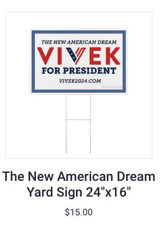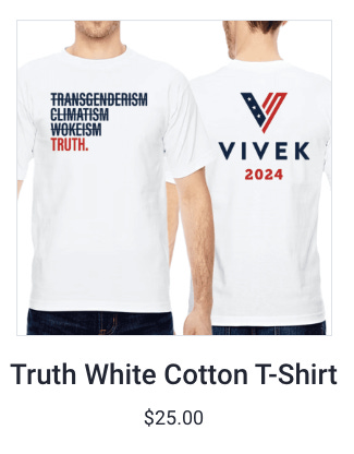 Perhaps in recognition of his lack of name recognition, the former tech and finance executive has leapt into the race with a vast war chest of campaign merchandise. There are 66 featured products, mostly tees but also signs, caps, cups, and copies of his 2021 book, Woke, Inc. Almost all include the name “Vivek,” or in some cases “Vek” or “V.” None except for the book cover mention “Ramaswamy.” The candidate’s teeming mass of messages include: “Excellence Over Politics,” “Keep America Free,” “Save America—Vote Vivek,” “Stop Wokeism—Vote Vivek,” “The New American Dream,” “VEK-TORIOUS,” “Courage is Contagious,” “Don’t Tread on Vek,” “Say the Quiet Part Out Loud,” “Free Thinking American,” and “Truth.” One design for shirts and coffee mugs lists four words, the first three crossed out: Transgenderism, Climatism, Wokeism, Truth.” How can he lose?