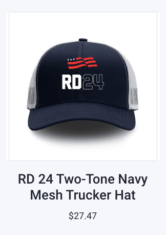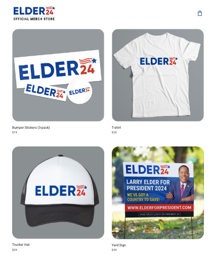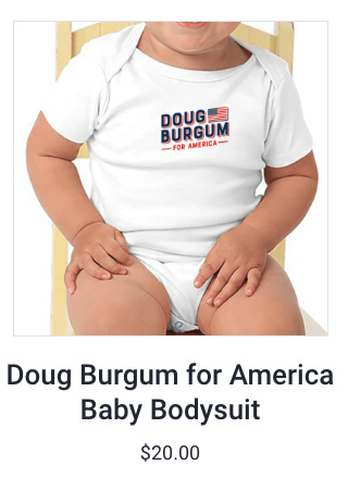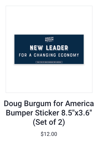 The former governor of North Dakota’s preponderant merch message is “Doug 24 Burgum,” which sandwiches the year of the election between the two parts of his name. The campaign is also selling an adorable “Doug Burgum for America” baby bodysuit and a bumper sticker that proclaims “New Leader for a Changing Economy”; the candidate’s name is barely visible. There are 18 featured items ranging from $12 all the way up to $35. Notwithstanding his nice-looking logo, something about Burgum’s campaign shouts “Not Ready for Prime Time.”