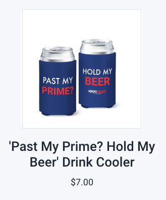 The former governor of South Carolina and U.S. ambassador to the United Nations under Trump prominently displays the button for “Store” at the very top of her campaign website. And no wonder, as it contains an impressive array of refreshingly plucky products. There are “Nikki for President” golf balls, T-shirts, hats, and flags, along with other merch bearing such sassy slogans as “Sometimes it Takes a Woman” and “In My Prime”—a nod to Don Lemon’s career-killing claim that she was past it. There’s even an adorable foam can cooler with the words “Past My Prime?” on one side and “Hold My Beer” on the other.