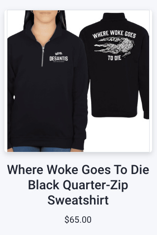 The Florida governor’s merch site is as deeply uninspired as every other aspect of his campaign. It contains fewer than three dozen items, most saying the same three words: “DeSantis for President.” There are a few items that say “Great American Comeback” and “RD24,” which stands for, you guessed it, Ron DeSantis 2024. One T-shirt features a knockoff MAGA-type slogan—“Restore America.” Only a handful of products say anything else: a T-shirt that has “I’m a DeSantis Republican” on the front and “Freedom Lives Here” on the back; a “Youth T-Shirt” that says “Future Freedom Voter” on the back; a T-shirt with the belligerent inscription “Stop Pussyfooting Around” on the back; and a $65 quarter-zip pullover that features a backside drawing of an alligator with the message “Where Woke Goes to Die.” DeSantis’s merch site is where campaigns go to sleep.