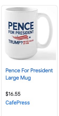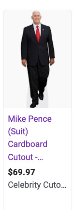 That said, 'Pence for President' merchandise is not hard to come by. A Google search for those words brings up dozens of items available for purchase by private vendors, including Mike Pence For President 2024 Campaign Scented Candles and Mike Pence Drinking Glasses. One can even buy a lifesize Mike Pence cardboard cutout, which appears indistinguishable from the original.