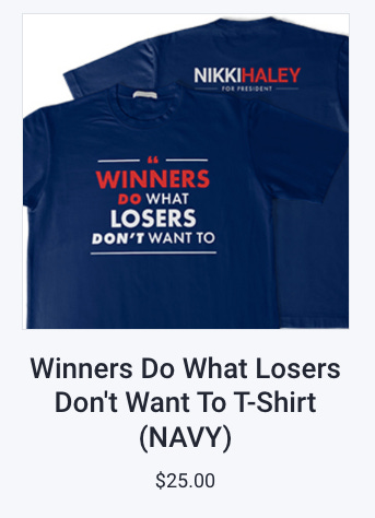 The site also sells tumblers, tees, and stickers that say “Women for Haley” and “Veterans for Haley,” proclaim “Strong & Proud NOT Weak & Woke,” and include her incomprehensibly inane quote, “Winners do what losers don’t want to.” The only piece of merch in Haley’s more-than-50 featured products that takes any kind of a shot at her rivals is a sticker that scolds, “Shame on you, Presiden Biden.” Prices run from $5 (a button) to $99 (“full-zip jacket”).