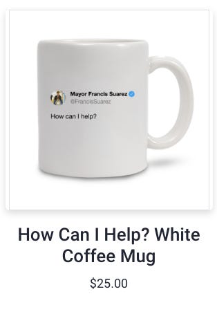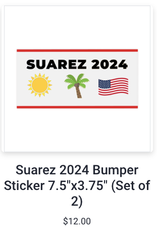 The latest entrant into the GOP presidential sweepstakes, hard-right Miami Mayor Francis Suarez, has 19 featured products, all bumper stickers, hats, mugs, and tees. His main recurring symbols are the sun, palm trees, and the American flag; he also experiments with vaporwave motifs, blocks of trendily formatted text, and images of Joe Biden peeking out of a garbage can (“Dump Joe Biden”). His one clever touch is selling items decorated with a Twitter post in which he asks, “How can I help?” The answer is obvious: More stuff.